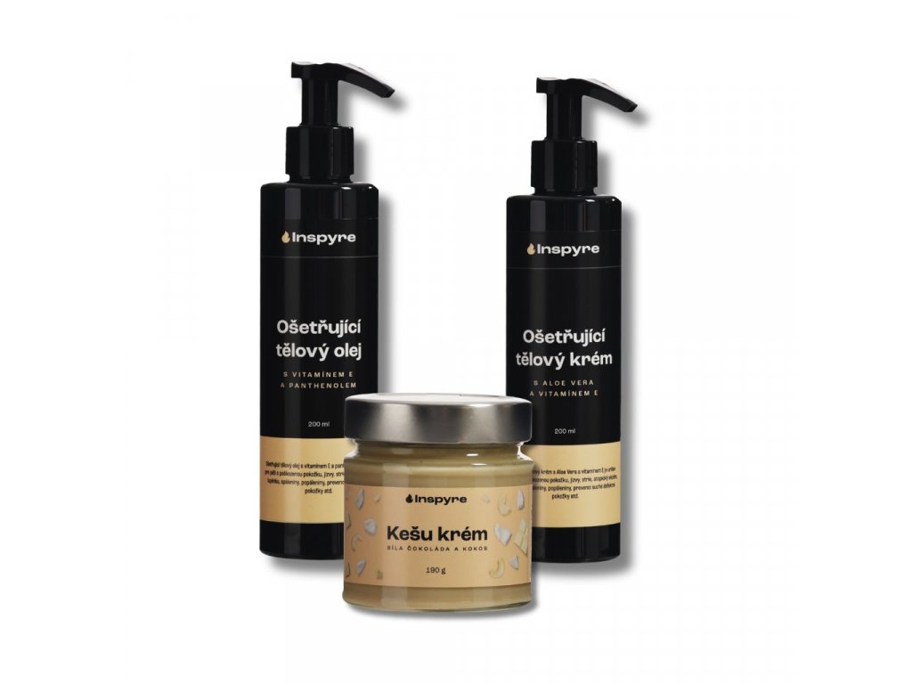 Dvojí pohlazeníOšetřující tělový krém s aloe vera a vitamínem E (200ml) nabízí intenzivní hydrataci a regeneraci. Ošetřující tělový olej s vitamínem E (200 ml) hloubkově vyživuje a ochraňuje pokožku před vnějšími vlivy. Kešu krém s bílou čokoládou a kokosem (190g) představuje neodolatelnou pochoutku, která osloví všechny vaše smysly. Jeho krémová textura a bohatá chuť dopřejí vašim chuťovým buňkám nepopsatelný zážitek, zatímco přírodní složení zajišťuje, že se jedná o zdravou lahůdku. Každý produkt je výsledkem pečlivého výběru surovin a naší vášně pro kvalitu. Naše výrobky jsou vyvinuty a vyrobeny v České republice s láskou a maximální starostlivostí o detaily.